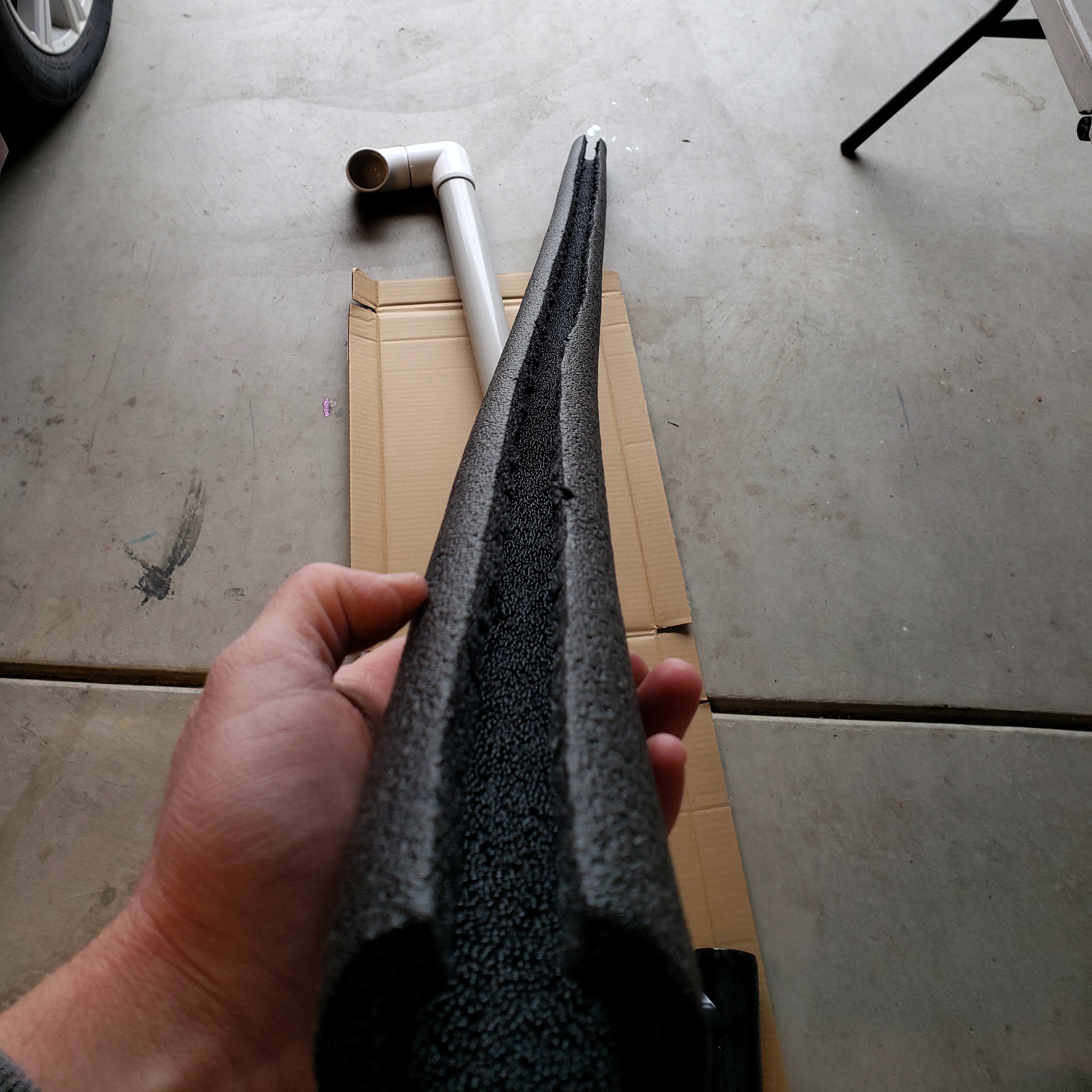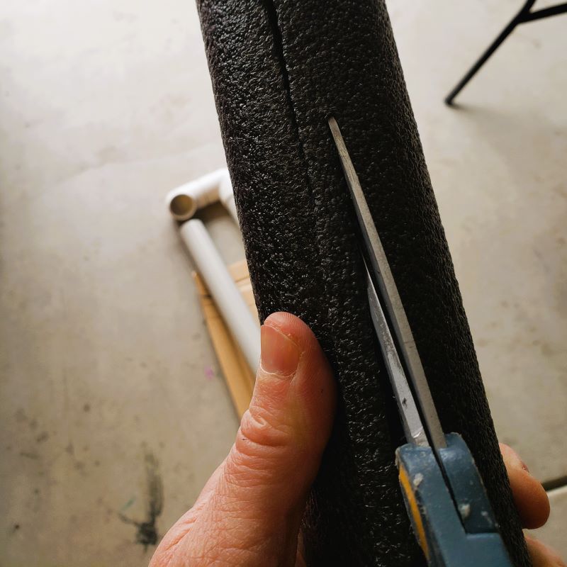 - I used the foam pipe insulation to cushion your rods inside the carrier during transport. The foam was slightly larger around than the inner diameter of the pipe, so I needed to cut a little bit (½’’ wide strips as a time) from the foam as shown. This way I had some room to squeeze it and slid it into the pipe.