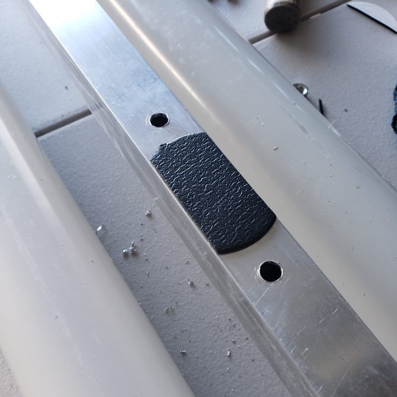 - Back at the table or on the floor, I took the U bolts and positioned them on the frame tube between the marks for the crossbars, and marked where to drill the two mounting holes at each end. Then, I drilled the holes. For extra protection for the cross bars, I added a strip of foam pad between the holes to make a “foot” to cushion the frame tube / crossbar connection.