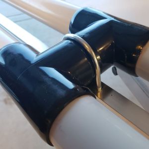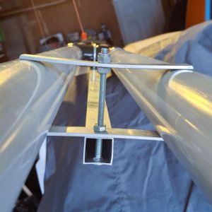 - Up at the top, I added another nut and spun it down just below the pipes. Then I added the second aluminum bar and another nut, and tightened down. This way, the top bar was under slight tension and to hold the pipes securely.