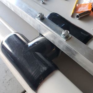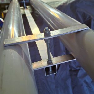 - I turned the carrier upside down and laid it flat, then put the aluminum tube on top of it, resting on the two “H” unions. I put the end of the tube about 6’’ from the box. I took the first U bolt and looped it over the “H” union nearest to the box, and carefully mark where to drill two holes in the aluminum tube. The U bolt was just a hair narrower than the H union, so I opening it up a little bit. Then I drill two holes at the marks and install the U bolt with the included plate and tightened it down.