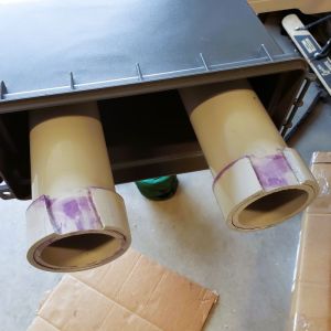 - With all of the foam in place, I modified the ammo box. I held the bottom of the box up to the assembled types and traced the ends onto the box, so I would know about where to drill out the holes. I wanted to make sure this connection could be made weatherproof so I made clean circle cut outs as close to the outer diameter of the pipe as possible.
